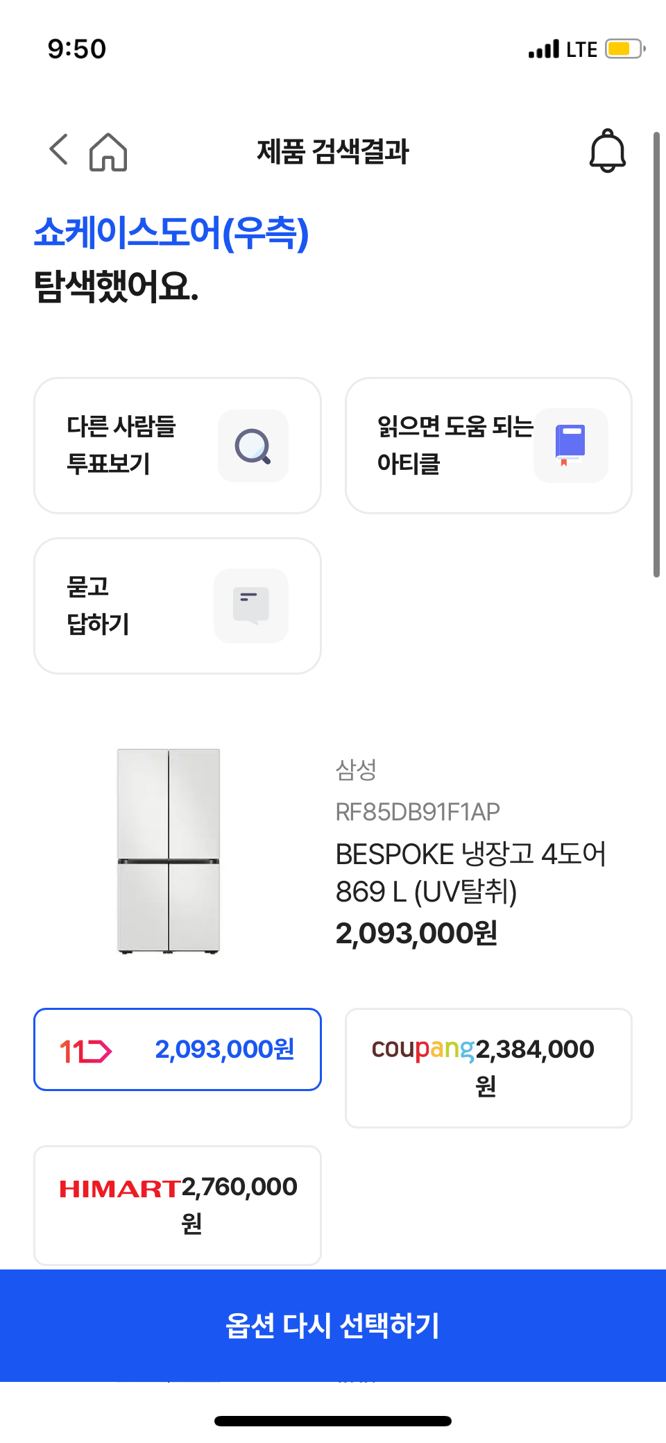 소형 김치 냉장고 검색 시에는 결과가 없었고, 이외에 대표적인 가전 제품들을 검색했음에도 검색 결과가 평균 10개 내외였다. 그나마 나온 검색 결과에서도 가격 비교가 충분히 되지 않는 것으로 보였다. 쿠팡, 11번가, 하이마트 가격 정도만 확인할 수 있었다. 고객이 제품의 스펙을 비교하고 합리적인 구매를 판단하기에 많이 부족해보였다...