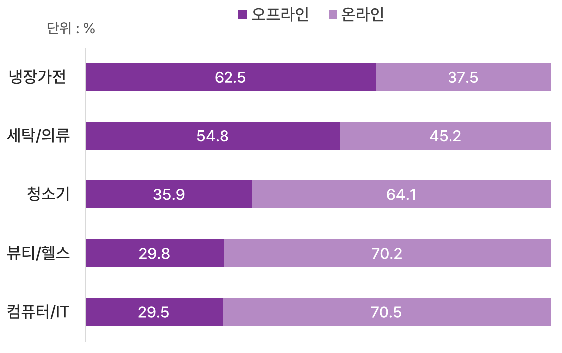 2023년 시장조사 기관 마켓링크에 따르면 내장가전과 세탁 및 의류가전 등 고가의 대형가전은 여전히 오프라인 이용률이 우위를 보이는 반면 청소기, 뷰티/헬스 기기 등 소형 가전 및 생활기기는 온라인 비중이 현격히 높았다. 또한 컴퓨터 및 IT 기기와 같이 비교적 고가이나 젊은 층 구매 비중이 높은 품목 경우 온라인 구입 비중이 74%로 오프라인 대비 높았다.