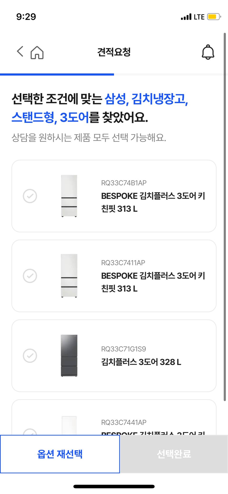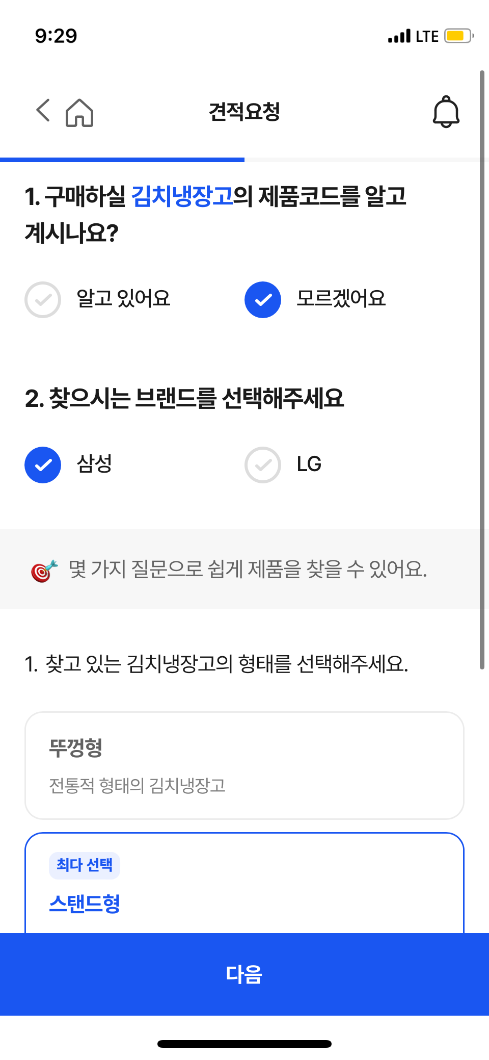 다만 아쉬웠던 부분은 견적 요청 시 선택할 수 있는 브랜드(삼성, LG)와 스펙이 매우 한정적이었다. 친할머니의 요청으로 100L 정도의 소형 김치 냉장고를 가전나우에서 알아보려고 했지만, 수요가 많지 않은 제품이여서 그런지 세부적인 견적 요청이 되지 않았다.