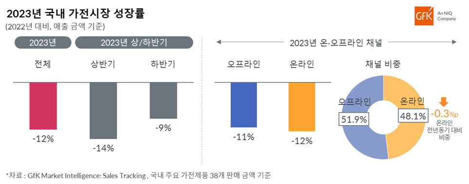 글로벌 마켓 인텔리전스 기업 GfK(지에프케이)가 2023년 국내 가전 시장 성장률을 발표했다. 시장은 -12% 하락한 것으로 나타났다.